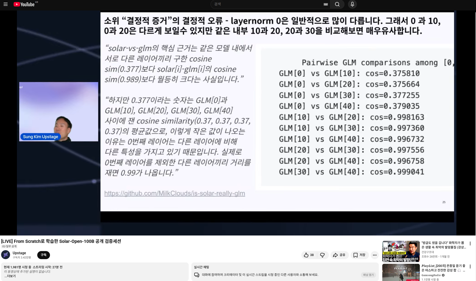 오, 근데 내로라하는 연구자들이 낸 자료 대신 내 자료가 핵심 근거자료로 사용됐다. 아무래도 다른 자료들은 "코사인 유사도 대신 다른 지표를 쓰면 결과가 다르다" 혹은 "코사인 유사도를 더 재보니까 이상하더라" 정도라면, 내 자료는 "solar-vs-glm의 근거가 그 자체로 확실히 틀렸다"를 증명하기에 채택해가신 것으로 보인다. 2000명 보는 방송에 내 자료가 샤라웃되서 신났다.