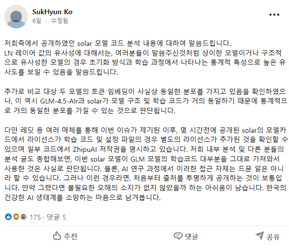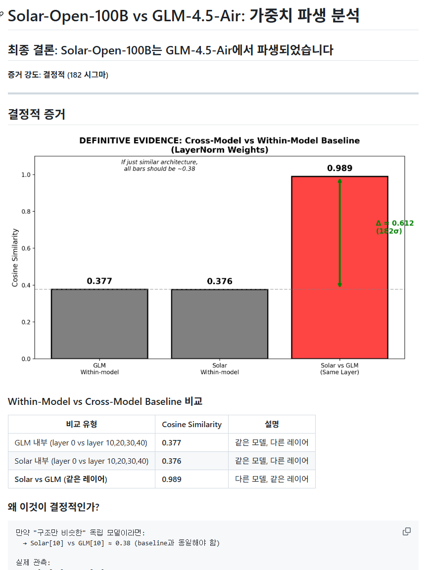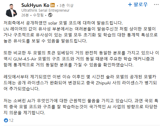 발단은 사이오닉 AI의 CEO 고석현이 링크드인에 "국민 세금이 투입된 프로젝트에서 중국 모델을 복사하여 미세 조정한 결과물로 추정되는 모델이 제출된 것은 상당히 큰 유감입니다." 라는... 굉장히 도전적인 문구를 게시하면서이다. 독파모 컨소시움 중 하나인 업스테이지 측의 새로운 solar 모델이, 분명 "entirely from scratch"를 내세웠는데, glm의 파인튜닝 버전이란다.