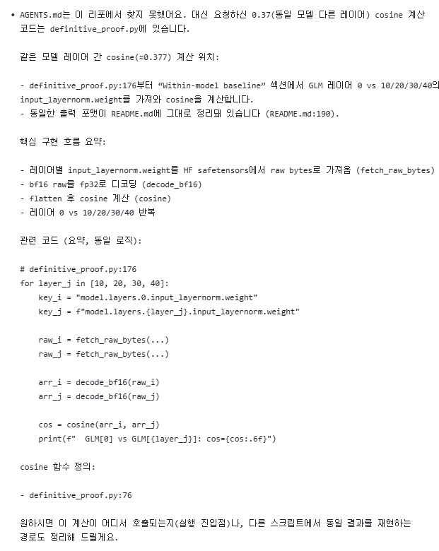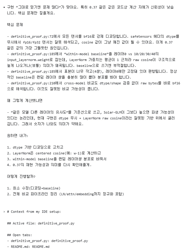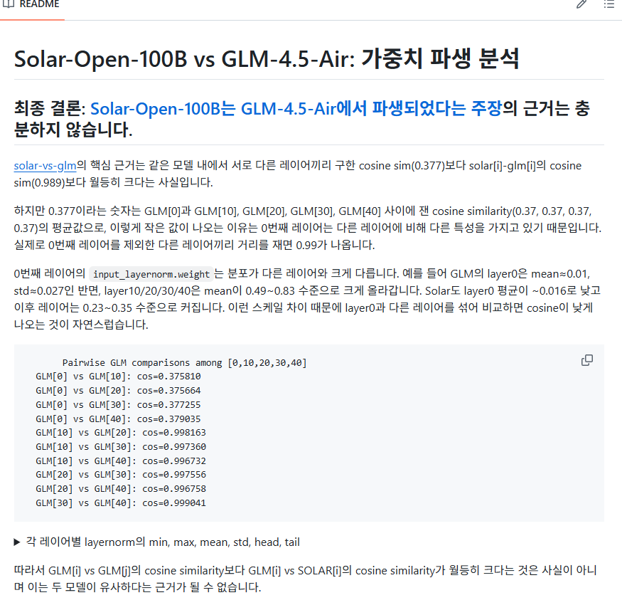 실제로 내가 재보니 0번째 레이어가 아닌 다른 레이어를 사용하기만 해도 결론은 "solar는 glm의 파생 모델이다"가 아니라 "solar는 glm의 파생 모델이 아니다"로 바뀌는 것을 확인했다. 너무나도 쉽게 결론이 바뀐다. 즉 근거로서 증거력이 매우 약하다는 말이다.